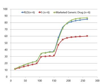 实验结果:参比制剂跟自研药样品表面看来极为相似,然而生物等效性实验实际显示自研产品比参比制剂释放慢,可是在以下图表未能呈现出来。