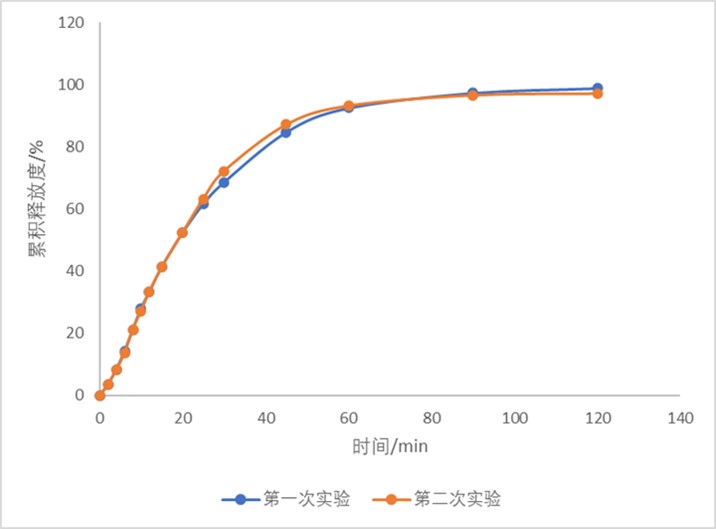2. 流池法实验:相同的口溶膜,在流池法中得到缓慢的溶出曲线,且平行性和重复性均符合要求。