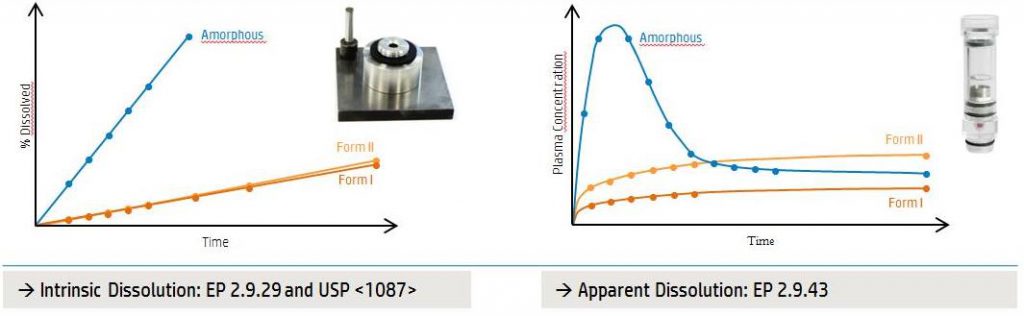 测定原料 API 溶出速率最常用的方法有固有溶出度测试法和表观溶出度法,两者之间有较大的区别。固有溶出度方法是在规定的实验条件下,测试 API 在固定表面积情况下的溶出速率。这种方法需要事先经过一系列的处理,将粉末样品经压外力制后进行测试。但是对于多晶型药物来说,施压本身有可能诱导粉末的晶型转变,因此,用此类方法所测定得到的溶出速率很有可能不是待测特定晶型下的溶出度。