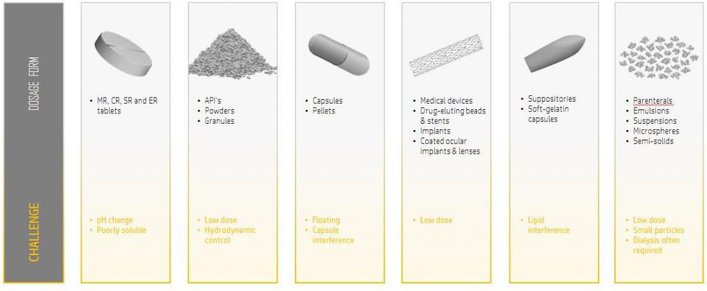 流通池法溶出度测试令人青睐的原因之一,是因为方法为不同的制剂形态设计了不同的专业流通池,也就是说,只需要用一种方法和设备,便可以完成从原料、中间体、到最终制剂一系列产品的溶出度测试。