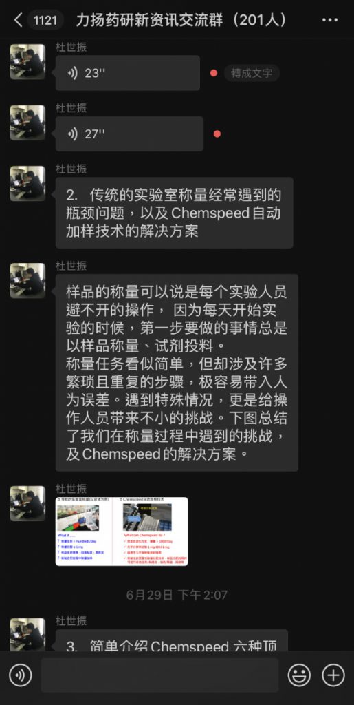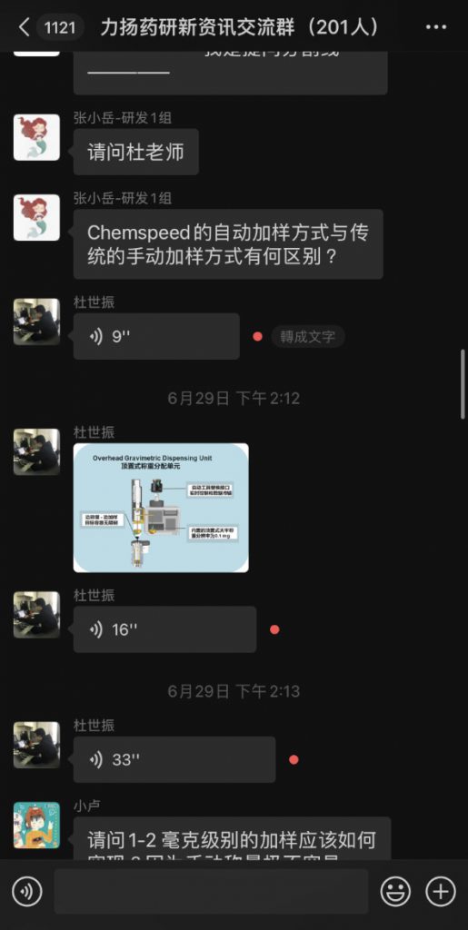 为促进群组成员交流,力扬于 6 月举行了微信群组线上问答活动,与群组成员讨论自动化技术如何攻克新药研发难关,讨论由实验室自动化专家杜世振博士率先带领分享,然后为群组成员解答疑难,例如:加样效率的提升、如何实现精准的粉末及液体加样等等。