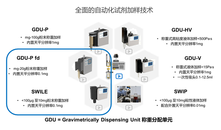 第一个是 GDU-P fd (见下图中蓝圈处),此工具适用于有足够物料来源的样品,比如实验室的常规试剂。当物料有几十或者上百克可以用时,这种情况下便可以将物料预先填装到 GDU-P fd 的物料罐内 (30mL),然后通过 GDU-P fd 天平进行自动加样。