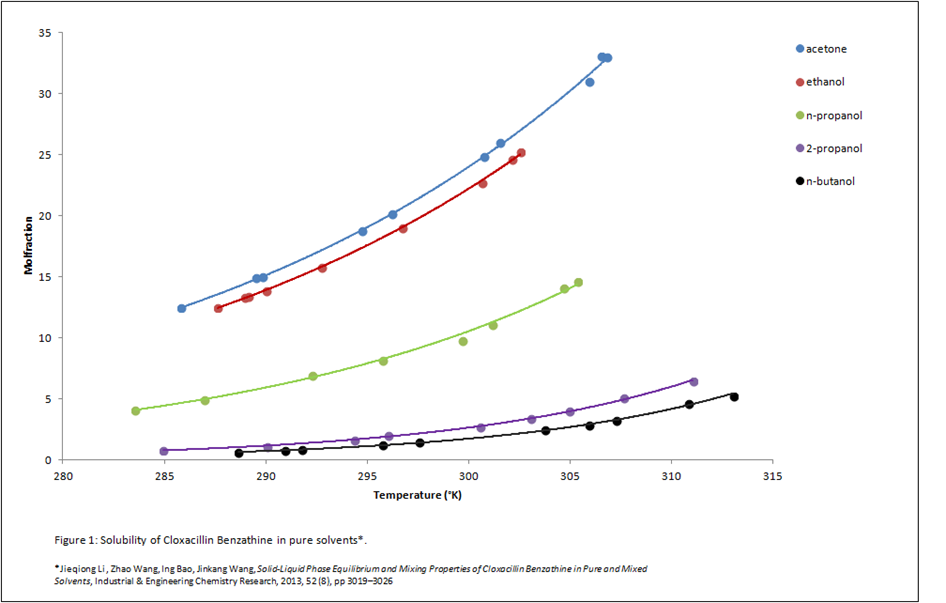 强生实验室使用 Technobis Crystal16 测定了苄星邻氯青霉素在各种溶剂中的溶解度。实验采用了温度变化法,按程序进行升降温,并实时检测、记录体系的溶解性数据,14 小时内即可完成 4 种不同溶剂下的溶解度测定,而测试所需的API少于500毫克,真正实现降本增效。