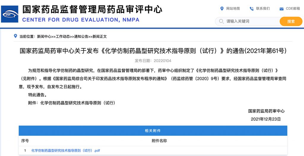 2022伊始,国家药监局药审中心发布《化学仿制药晶型研究技术指导原则(试行)》,对仿制药晶型选择、晶型研究思路、研发中晶型问题的关注点、药物晶型的表征和控制等作出明确的技术规范指导,并于发布当日实施执行。