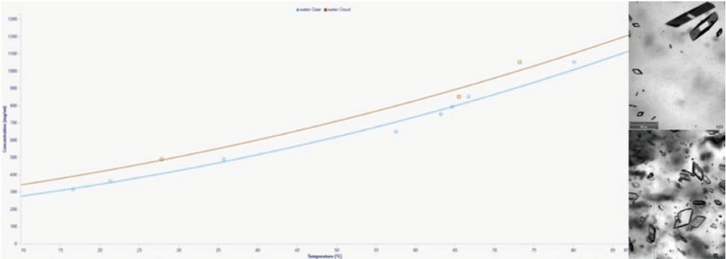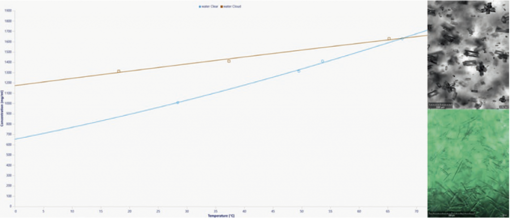 方法:Technobis 专业的结晶研究仪器 – Crystalline 是使用热变量法有效收集和分析溶解度数据的理想工具。将粉末状水合盐称量到 8 ml 结晶瓶中,然后加入 3 ml 去离子水。样品配有顶置钩形搅拌器。样品以 0.1 ºC/min 的速度加热至 70 ºC,然后保持 10 分钟以达到平衡,再以 0.1 ºC/min 的速度冷却至 5 ºC。利用 Crystalline 高分辨率相机和新型粒子检测技术,可以在有色和较暗的样品中采集清点和浊点,这在以前是一项挑战。但利用这项技术,我们能够收集硫酸铜和硫酸镍的溶解度和析出曲线。