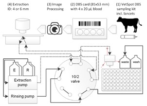 图 1. 牛干血斑采集和 全自动样品萃取流程图。