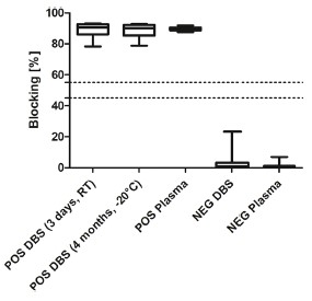 从左至右的五个条件分别为室温保存 3 天的阳性干血斑、-20°C 保存 4 个月的阳性干血斑样本、阳性血浆样本、阴性干血斑样本和阴性血浆样本。抗体效价说明: >55% 认定为阳性,<45% 认定为阴性,45% – 55% 之间为怀疑样本。