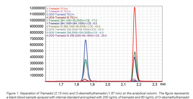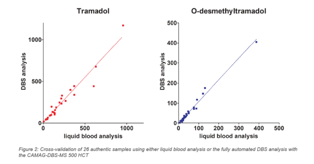 目前DBS-MS 500 HCT已成功应用于自行车运动员的兴奋剂检测。曲马多(Tramadol),是一种阿片类药物 ,主要用作镇痛药,可缓解普通到严重的疼痛。由于其在竞技自行车运动中的滥用,2019年国际自行车联盟已将其列为禁用药物。针对曲马多 (tramadol)及其代谢物O-去甲基曲马多(O-desmethyltramadol),CAMAG 开发了一种方法,能够实现4分钟从样品到结果的全自动分析(图1)。研究者对26个真实样品的进行传统血检和DBS检测,并将两种方法进行了交叉验证。结果显示,借助DBS-MS 500 HCT,DBS检测和传统血检的结果一致良好(图2),证明了DBS兴奋剂检测的可行