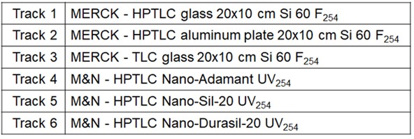 在色谱系统中薄层板的材料是一个关键参数。由于硅胶的规格不同,例如不同的粘合剂或荧光指示剂的存在,不同的薄层板可能会有不同的选择性。