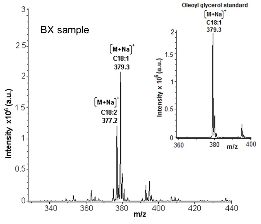 3. 使用 TLC-MS 接口将 B100 样品的单酰基甘油酯谱带 (16 – 20mm) 转移至 ESI-MS,并与相应的油酸甘油酯标准品进行比较,MS 信号:m/z 379.3 处的质量信号 (油酸甘油酯) 是分析样品中最丰富的信号,结果见图 3。