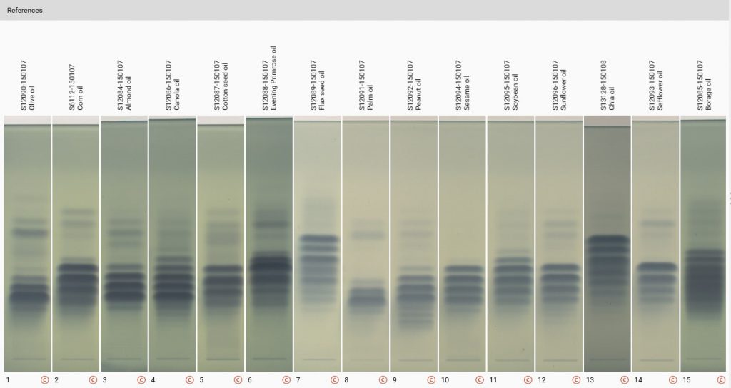 4. HPTLC-ESI 谱图还显示了与样品中其他单酰基甘油酯相对应的其他离子, 因此,可以获得 BX 中相应单酰基甘油酯的脂肪酸谱,有助于识别生物柴油中脂质的来源 (即植物油、动物油、废弃食用油),除质谱数据外,也可根据HPTLC谱图数据库对比鉴别脂质来源,部分高效薄层色谱电子对照图谱可见图4。