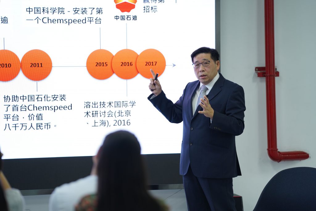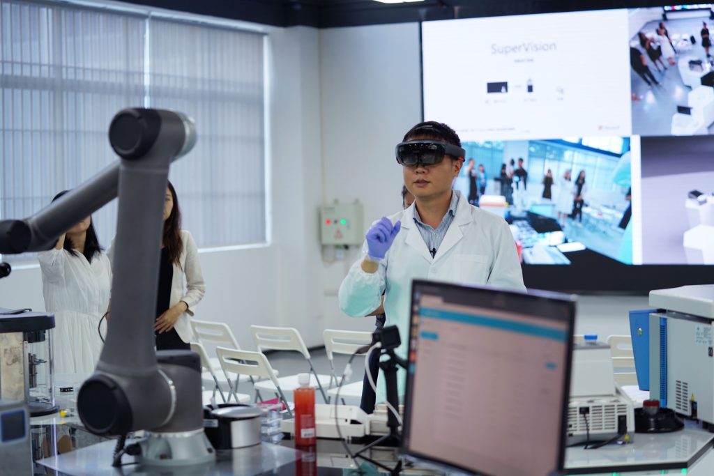 力扬企业的研发主管郑波博士在现场为大家亲自演示了实验室的智能化操作流程。通过软件系统的集成并借助 MR (Mixed Reality) 眼镜实现了 LABVO 智能型实验室的人机交互功能,实验全程研究人员不需要远距离的移动便可以轻松查看、管理、控制整个实验流程,更值得一提的是,智能化的操作使得整个实验流程变得简单、便捷,即使是没有科研背景的普通工作人员也可以快速上手操作,精准完成简单的实验步骤。