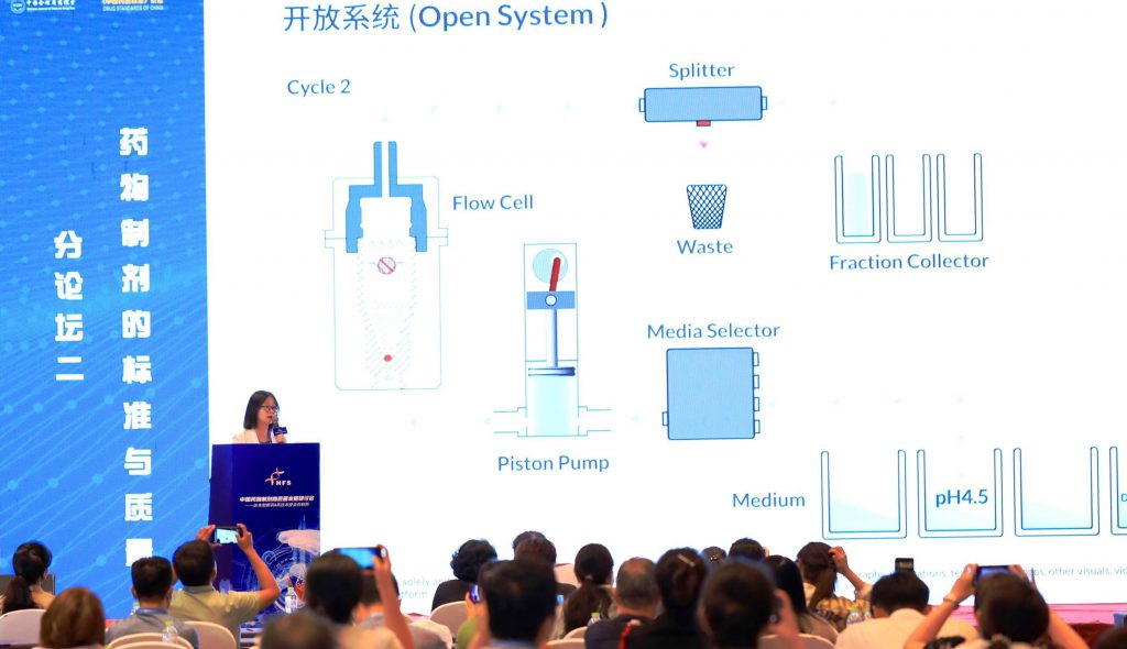 在 29 日下午的分论坛二中,力扬业务发展总监赵宇就《流池法溶出度测试在口服缓控释制剂及复杂注射剂中的应用》主题展开了报告演讲。