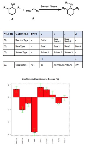 Procos 使用 Chemspeed Autoplant Prores 系统进行了一个高通量反应筛选的 DoE,研究了不同变量对一个对映选择性 SN2 反应结果的影响,即通过 D-Optimal Design,同时研究三个多层次的定性变量 + 一个定量变量,从而在 250 多个可能组合中选择了 40 个实验 (+8 个重复) 进行实验。