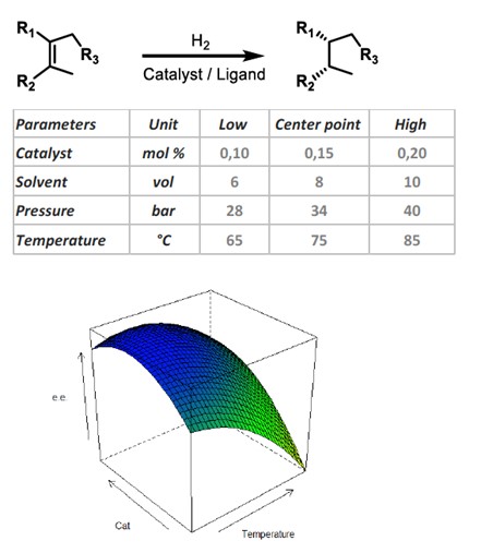 Procos 公司进行了另一个对映选择性氢化反应的研究,通过面中心复合设计 (Face Centered Central Composite Design) 在 3 级 4 个变量 + 3 个中心点规划一组 27 个反应,对对映体过量成功进行了优化。