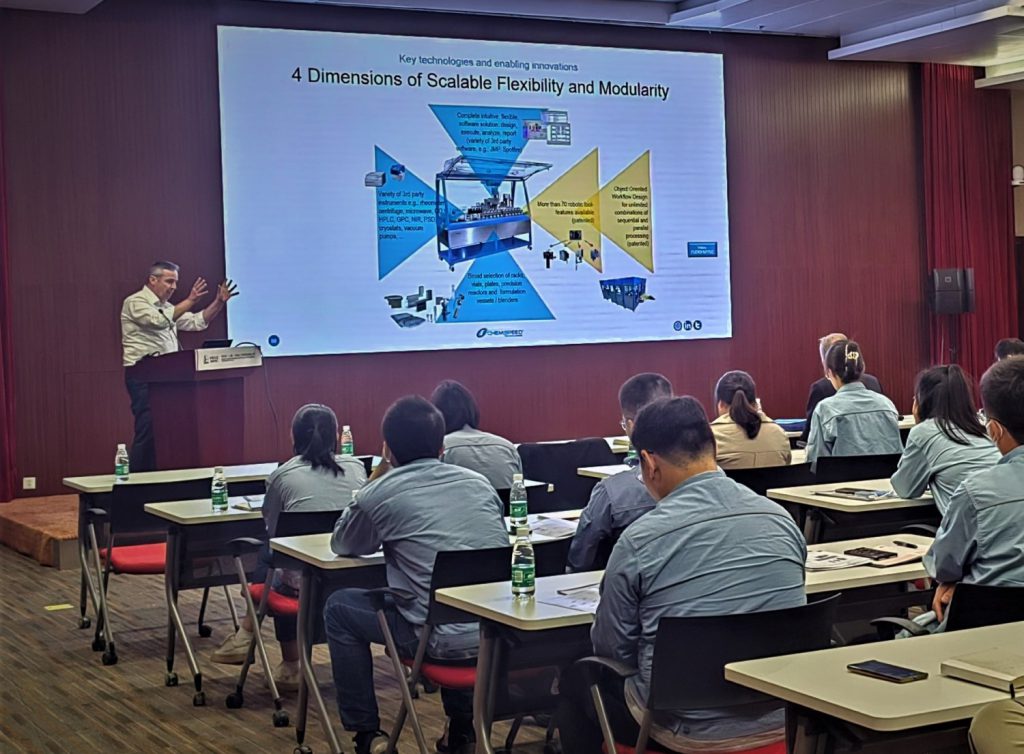 在这次交流之旅,力扬企业行政总裁黄凯扬先生、瑞士 Chemspeed 公司行政总裁 Rolf Gueller 博士等与各单位科研人员就自动化、数字化实验室的建设进行了深入交流。Rolf Gueller 博士以 “彻底的动态数字孪生技术” 主题开展讲座,对数字化实验室的建设提供了世界先进的范式解决方案,并吸引超过 280 位科研人员及主管的参与。