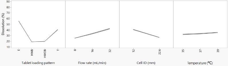 图3. 通过数学模型预测了四个参数对水杨酸溶出度的影响。药片装载模式的首字母缩写为 HWB(在装有玻璃珠的药片支架上)、HWOB(在没有玻璃珠的片剂支架上),T(在玻璃珠的顶部)和 E(包埋)